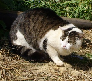 Freezing describes the cat’s sudden assumption of a totally immobile posture, usually in response to an environmental or social stimulus. Although a cat may freeze with its body in any position, it is most common for the cat to assume a crouching posture as it freezes. Evidence of emotional arousal is frequently observed in that the senses are usually orientated towards the stimulus which elicited the freeze, with a fixed gaze and dilated pupils. Ears may be orientated pricked towards the stimulus or may be flattened sideways (see negative emotional states) and whiskers may be pricked forwards or pulled back against the face. The tail may be held out behind the body along the ground or more commonly tucked around the body and paws. Muscles are usually tensed so that the cat appears poised.