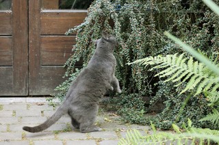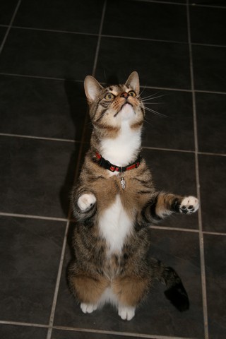 Object supported rearThis position can be supported for longer periods as the cat lifts its forequarters off the ground but then places its front paws against a vertical surface or onto a higher horizontal surface so that the full weight is not balanced over the hind legs. For this reason in an object supported rear the body may be angled forwards as the centre of gravity does not need to shift backwards as much and the hind limbs may be flexed but are more commonly extended (to give the cat additional height). |