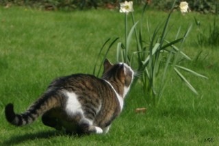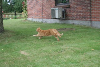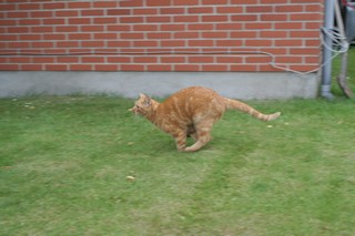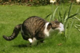 This gait, also sometimes referred to as a fast gallop, is the fastest gait and is usually only sustained in short bursts. This is also a three beat gait, but unlike the canter may have either a single or double suspension phase depending on speed. The fastest gallop will have two phases where all four feet are off the ground simultaneously. During a gallop, impetus from the hindquarters propels the forequarters into the air and the cat bounds forwards, all four feet off the ground and with the spine fully extended. One forepaw will then contact the ground fractionally before the second, the spine flexing to draw the hindquarters under the body so that the hind paws will contact the ground again, one fractionally ahead of the other. The hind paws cross the forepaws as they contact the ground. In a double suspension gallop, the forelimbs have left the ground for a second time before the hind limbs land such that the cat is suspended with the back in flexion as well as during the phase of extension.