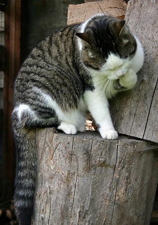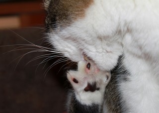 In the following video you can see how bouts of licking intersperse the biting of the nails during grooming of the paw. |