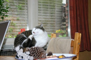 The claws on the back feet can be used to scratch at the skin and fur around the back of the head, under the chin and below or behind the ears. When scratching, the toes are extended and spread out and the nails are extruded from their sheaths to act as combs which can pull through the coat to the skin. Scratching for grooming consists of rapidly repeated backwards and forwards movements – the backward pull penetrates the fur to comb it and the forward movement takes place slightly lifted from the fur to reposition the claws for the next stroke.