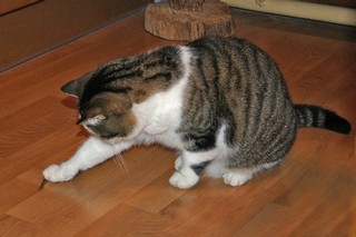 Cats’ paws are very sensitive as they contain a large number of mechanoreceptors. Extending a forepaw to pat or push an object provides the cat with information through touch. This video illustrates a cat using one forepaw to paw a new object in his environment. He then sniffs his paw briefly to gain further information about the object (see sniff section), although this sniffing response is not always seen. The paw can also be used for other purposes (see ingestion, play and social behaviour).