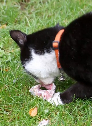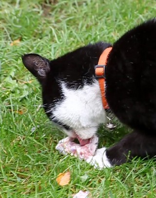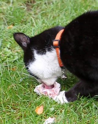 The cat will often lick prey to remove fur or feathers so as to expose the flesh. Once it is exposed the cat will also commonly lick the flesh. The papillae (small backwards facing barb-like structures) on the tongue can help the flesh to adhere to the tongue and thus aid transport of food from the carcass to the cat’s mouth. The following photographic sequence illustrates a cat licking a prey item.