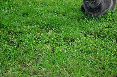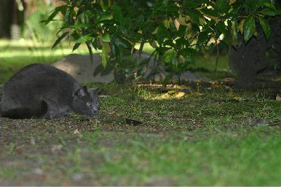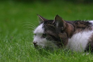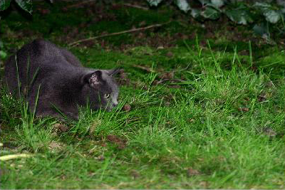 Staring is the fixation of the gaze on a particular prey (or item perceived as prey). This cat is in a stalking posture – the body is crouched and close to the ground, the neck is extended forwards towards the prey and the eyes are staring at the prey.