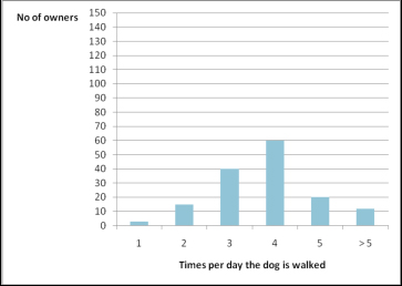 In this case the mode is the squat posture, adopted by most of the dogs in the sample. It is clear that in this case a mean value does not have a great utility. Indeed, the mean and the median would reflect just the numerical distribution of data per category (i.e. how many individuals are in each group, which merely depend on the number of animals that we decide to observe). The mode instead gives a clear idea of what posture is adopted by the larger number of individuals between the dogs observed. Example 2. We want to know how many times per day dogs are most commonly walked by their owner in our city. Therefore we interview a sample population of 150 dog owners. Data collected are summarised in the graph below: the most represented value is 4 (times per day), which is then the mode of our sample. Graphic representation of the example. The mode of the sample is 4, as it is the value more represented in the sample (60 owners walk their dog 4 times per day). Median The median is the value with an equal number of values on either side of it when data points are ordered from the smallest to the largest (Lehner, 1996; Howitt and Cramer, 2007), e.g. the middle value. Its numerical value is influenced only by being the central value and does not directly take into account the actual numerical values of the other data points, simply their positioning from smallest to largest, e.g. their rankings. In the case of a data set with an even number of values, the median value corresponds to the mean of the central pair of values (Clarke, 1994). The median is very useful to describe the average in a set of data, when these are not symmetrically distributed (i.e. many data are near a certain value). In these cases the mean is less useful as, being influenced by extremes it would be towards the value more represented. Example 1. The number of hours spent sleeping each day is measured in a population of 15 outdoor cats. The following data have been collected and ordered from the smallest to the largest score.