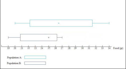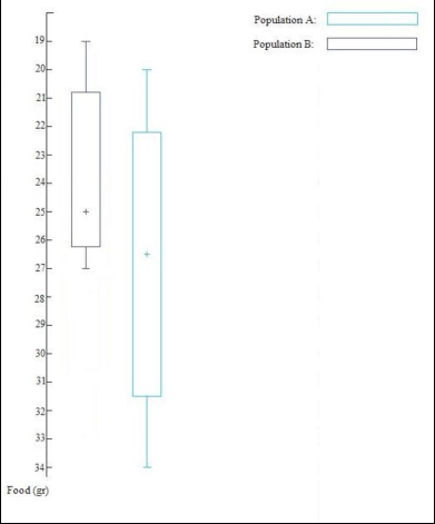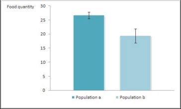 Graphic representation of the data sets shown in the example, using a box-and-whisker diagram. The extremes of the boxes represent the quartiles, the whiskers are the maximum and minimum values and the cross is the median of each set of data. The same graph can also be presented in a horizontal format, giving exactly the same information. As can be seen from the figure, box-and-whisker diagrams are very useful to compare sets of data before further analyses are performed as they provide a visual representation which allows the user to get a “feel” or “idea” or what their data looks like (note that data must conform to the same scale) (Clarke, 1994). For example, it can be seen very quickly and clearly, that on average Population A ate slightly more food (26.5 versus 26grams of food). One can also see the level of spread of the data (i.e. the range of scores across the individuals for each population) which can be summarised using the inter-quartile range. For example in the two populations of cats, the medians are very similar (26.5 grams for the population A and 25 grams for the population B), but the data of the population A are much more spread out than those of the population B; indeed the inter-quartile range for population A is 9.25, while the inter-quartile range for the population B is 5.5. Thus there was much more variation in how much food was eaten in population A in comparison with population B. Another graphical representation of the same example: the bar chart with standard error bars. Considering that the data are parametric, this kind of graph is the most appropriate.
